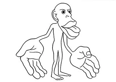 下の人形は「ホムンクルス」と呼ばれており、体の各部分を制御する神経細胞が脳にどんな割合で存在するかを示した人形です。手の指や舌は大きいのですが、腕や足や胴体は痩せています。つまり、ヒトの脳が指や舌に対してとても敏感であることを示しています。