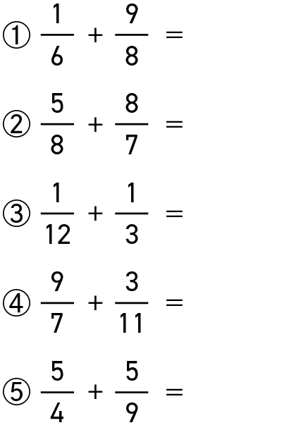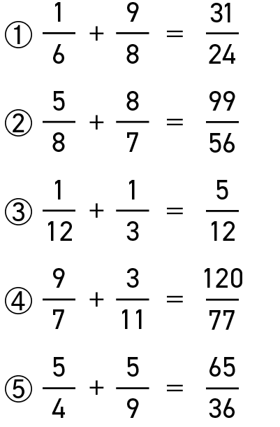 懐かしい「通分」の問題です。頭の中での計算処理は、メモを取りながらの計算と比べて疲れたのではないでしょうか。