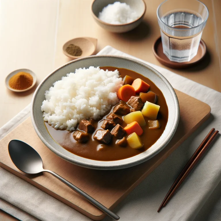 What is a (popular) (dish) in Japanese cuisine, adapted from (Indian) spices, that consists of (rice) topped with a thick, flavorful (sauce) made of meat, (onions), carrots, (potatoes), and curry powder, (often) served with pickled (vegetables) or a fried cutlet on the side?