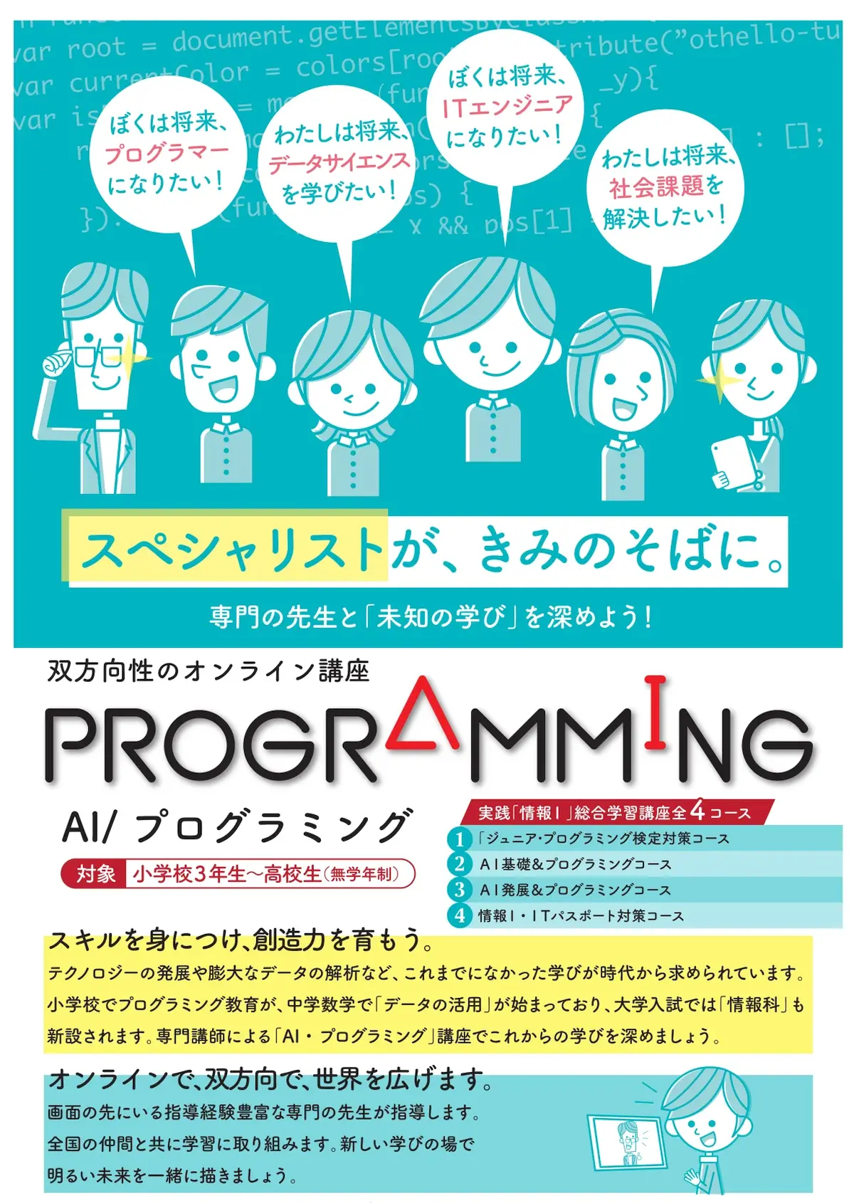 小学校でプログラミング教育が、中学数学で「データの活用」が始まっており、大学入試では「情報科」も新設されます。専門講師による「AI・プログラミング」講座で”これから”の学びを深めませんか。
